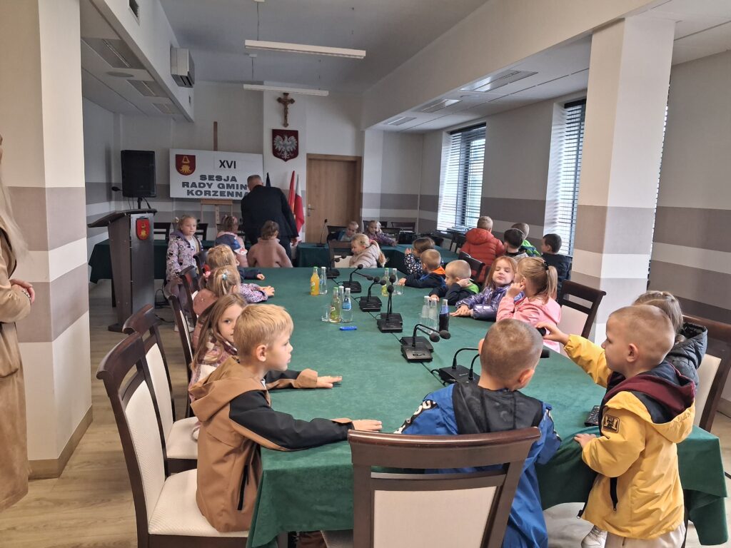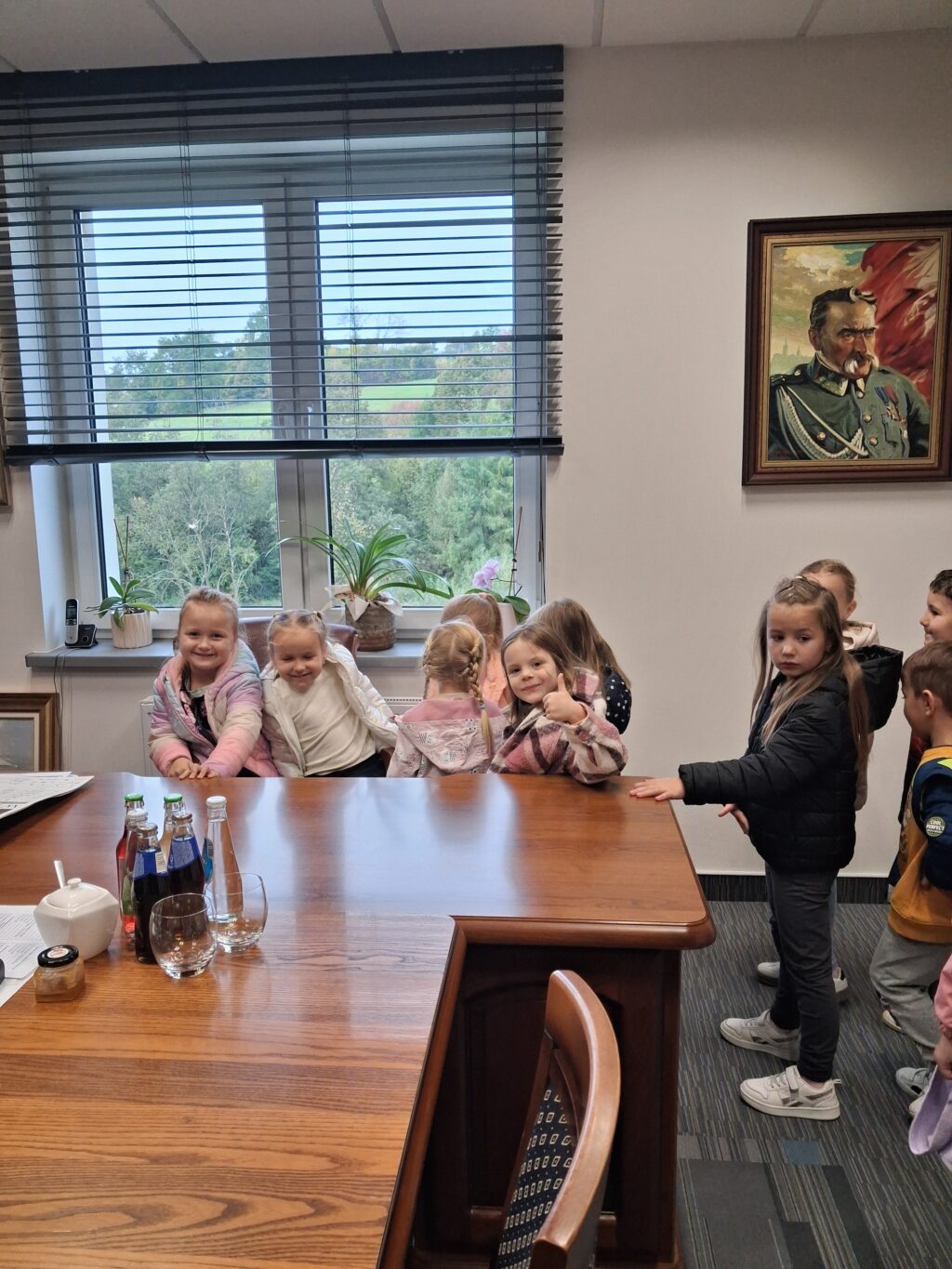 Przedszkolaki z grupy 0a i 0b udały się na wycieczkę do Urzędu Gminy w Korzennej. Celem było przybliżenie najmłodszym działalności instytucji samorządowej oraz budowanie poczucia lokalnej tożsamości obywatelskiej. Przewodnikiem po urzędzie był sam Wójt – Pan Leszek Skowron, który zaprosił dzieci do swojego gabinetu. Przedszkolaki miały tam okazję bezpośredniej rozmowy z włodarzem gminy. Poznały również pracowników urzędu oraz poszczególne biura. Dzieci mogły z bliska przyjrzeć się na czym polega praca urzędnika. Na zakończenie spotkania przedszkolaki wykonały pamiątkowe zdjęcie z Wójtem Gminy, a w podziękowaniu otrzymały słodki poczęstunek.