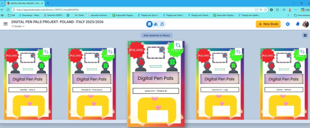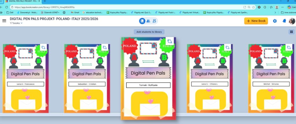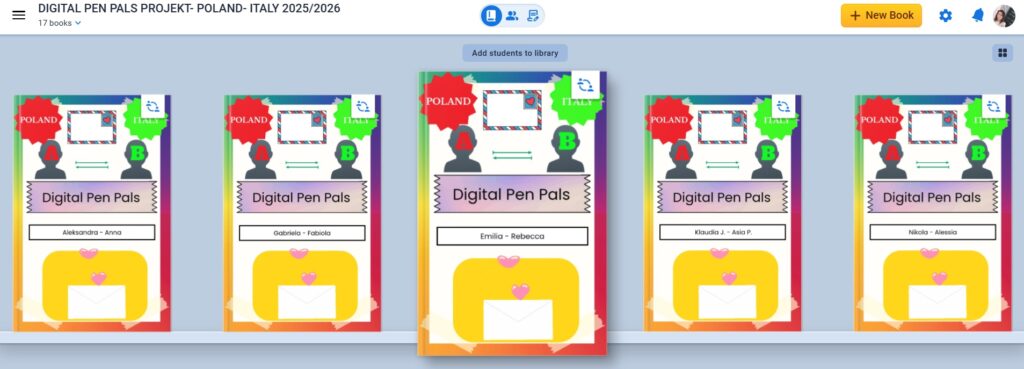 Projekt Digital Pen Pals Projekt polega na wymianie listów w formie cyfrowej między uczniami. Uczestnicy spotykają się na platformie Book Creator i mają do dyspozycji narzędzia takie jak: Canva, Bitmoji, GIFs, AI, 3D Models, Emoji i Stickers, Google Maps.