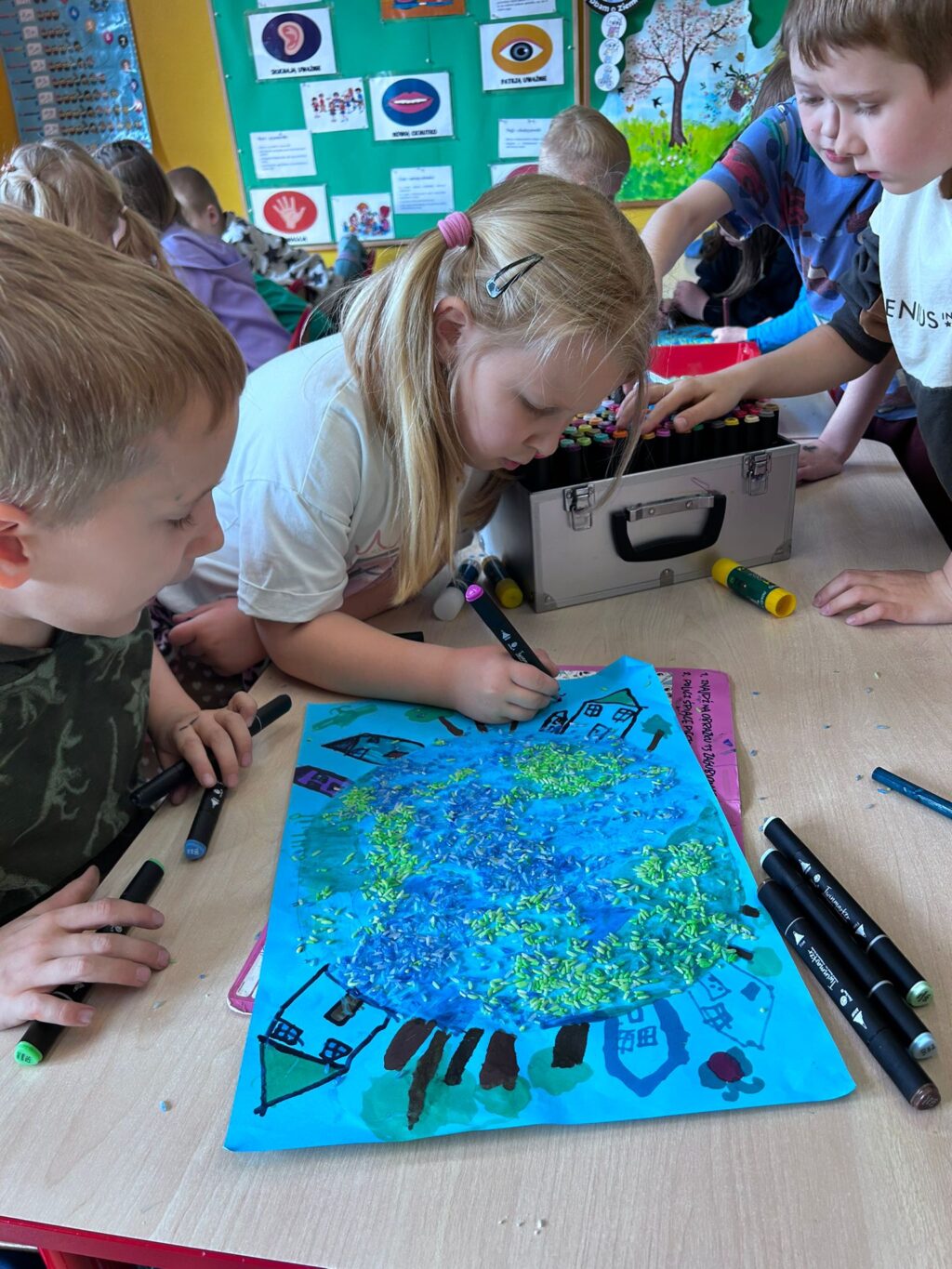 Podczas zajęć powstała wyjątkowa Ziemia z kolorowego ryżu oraz piękne drzewa– symbol życia i troski o naturę.